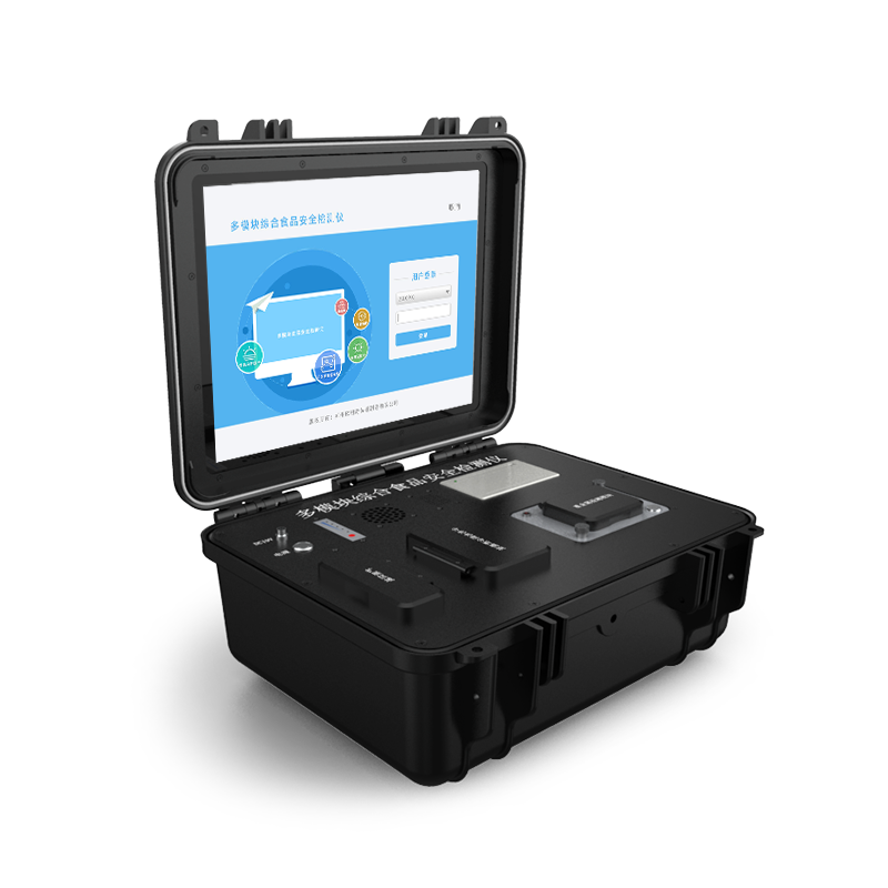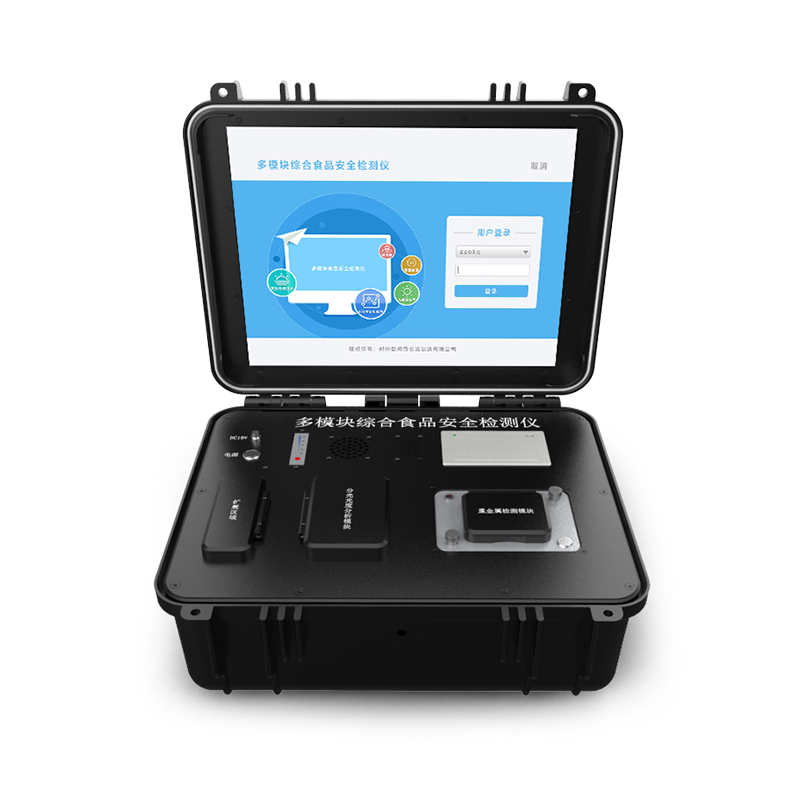 多模块综合食品安全检测仪集一体化多模块设计,内置分光光度法检测模块、干式化学(胶体金)检测模块、薄层色谱检测模块、荧光检测模块,电化学检测模块;操作简单,配置齐全,便携执法,检测项目丰富,可检测农药残留、食品理化、兽药残留、非法添加残留物等数十类检测项目。