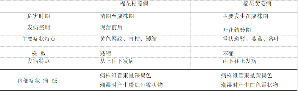 表 棉花枯萎病和棉花黄萎病症状比较