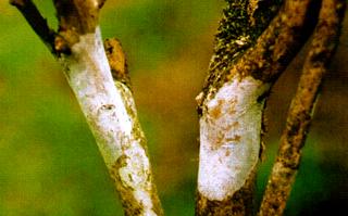 茶灰色膏药病:初期发生在茶树枝干上的介壳虫残体上,先产生白色绵毛状物,中央呈暗色.四周不 断延伸丝状物.圆形,中央厚,周围薄.形似膏药。老熟后呈紫黑色,干缩龟裂,逐渐剥落。湿度大时, 上面覆盖一层白粉状物。