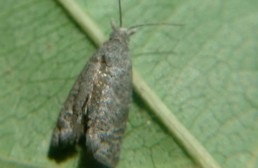 成虫:体灰褐色,复眼大,黑褐色。触角线状,灰褐色,着生于复眼之间,停息时触角向后延伸。下唇须短,灰色,先膨大后变细,折叠前伸。胸部灰色,混有白色鳞片。雌蛾的腹部较雄蛾肥大。雄蛾体长5〜7mm,翅展触角前7节粗长,第八、九节变细,形成一斜凹槽,第十一节有一锤状突起。前翅延长,盖住后翅,灰黄色或灰褐色;有前缘褶且不及中点,基斑、中带和端纹不明显。前翅前缘中部到顶角有5对银白色的钩状纹和黄褐色的云纹相间。前翅中室下方1/2处有1丛竖起的灰白色鳞片,中室下缘的中部和后缘的臀角区各有1个黄褐色的三角斑。停息时,两前翅的斑纹构成1个明显的图案。雌蛾体形较大,体长6〜7mm,翅展15〜17mm。前翅灰黄色,翅面斑纹较雄蛾不明显,前翅前缘近基部不加厚,无前缘褶。